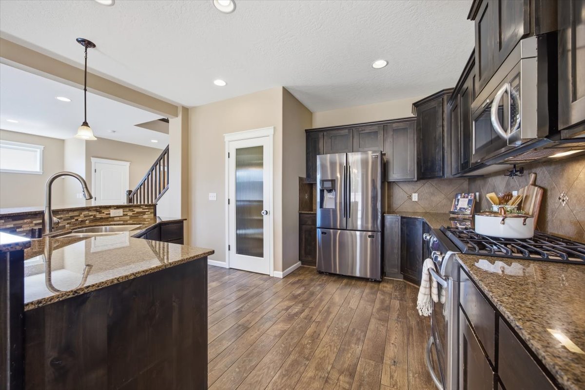 Chef’s Kitchen: oversized center island with granite counters, stainless steel appliances, walk-in pantry, and soft close cabinets